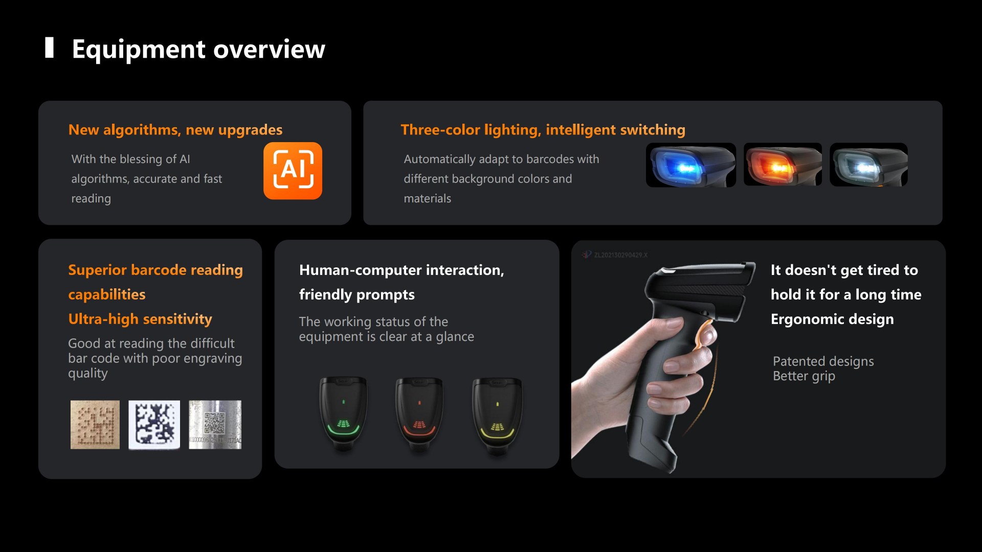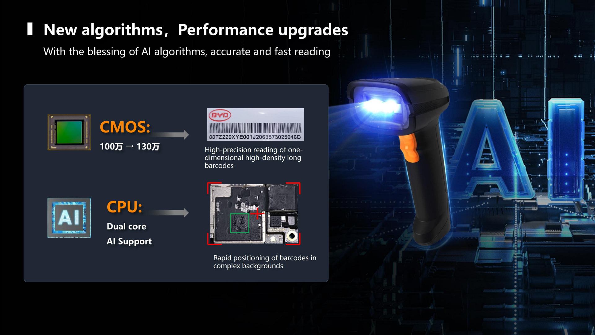 2. معالجة سريعة ثنائية النواة مع قدرة الذكاء الاصطناعي: لقد تحسنت وحدة المعالجة المركزية بشكل كبير من النواة الفردية السابقة إلى النواة المزدوجة، ومع قدرة فك التشفير 1.3 ميجا، يمكنها قراءة الباركود 1D الطويل عالي الكثافة، مع دعم الذكاء الاصطناعي الذي تم تدريبه من خلال أكثر من مائة ألف باركود، يمكنها التقاط الباركود بسرعة وفك تشفيره بدقة.