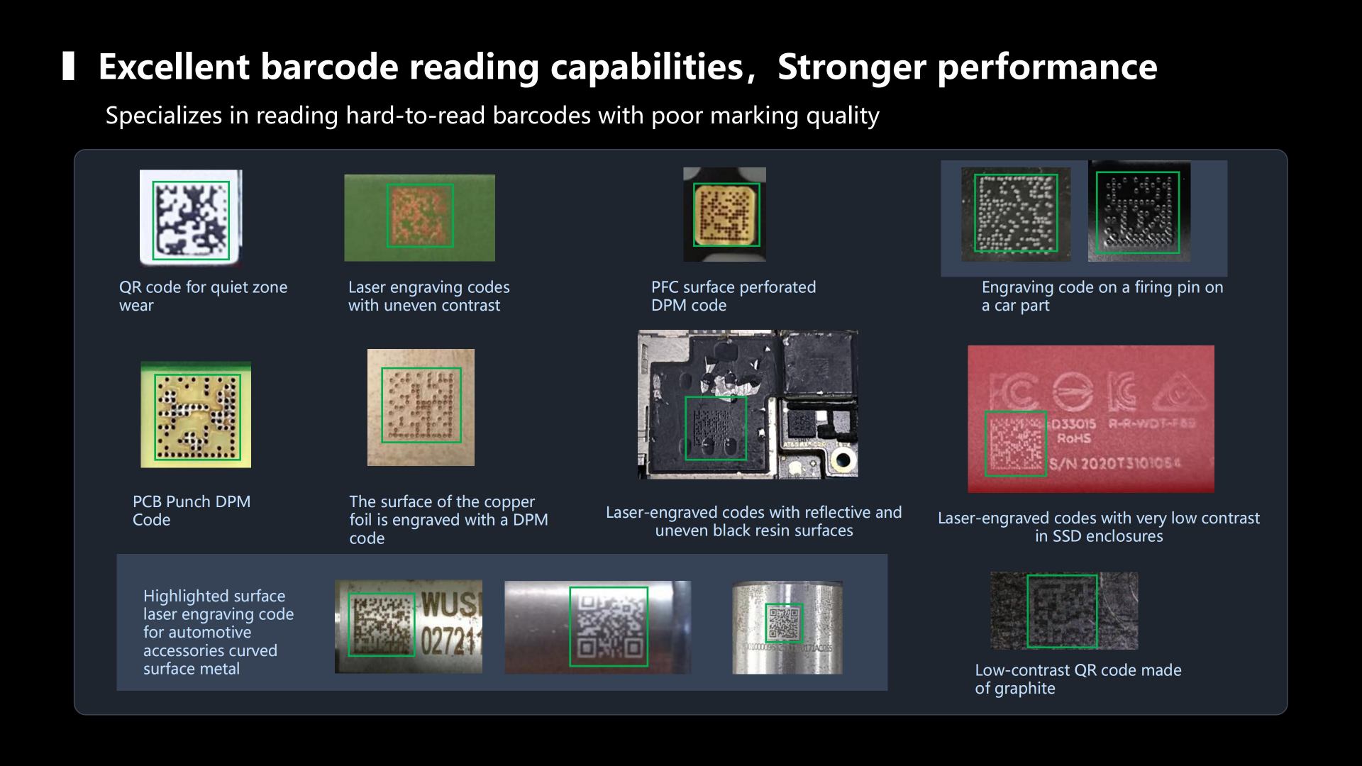 متخصص في قراءة رموز DPM مع مشاكل مثل رموز QR البالية في المناطق الهادئة، والرموز المحفورة بالليزر ذات التباين غير المتساوي، ورموز DPM المثقبة لـ FPC، ورموز dot peen على أجزاء السيارات، ورموز QR ذات الجرافيت المنخفض التباين، ورموز DPM المثقبة لـ PCB، ورموز DPM المحفورة على رقائق النحاس، ورموز الليزر على المعدن القوسي الساطع لأجزاء السيارات، ورموز QR غير المتساوية المصنوعة من الراتنج الأسود العاكس على أغلفة SSD.