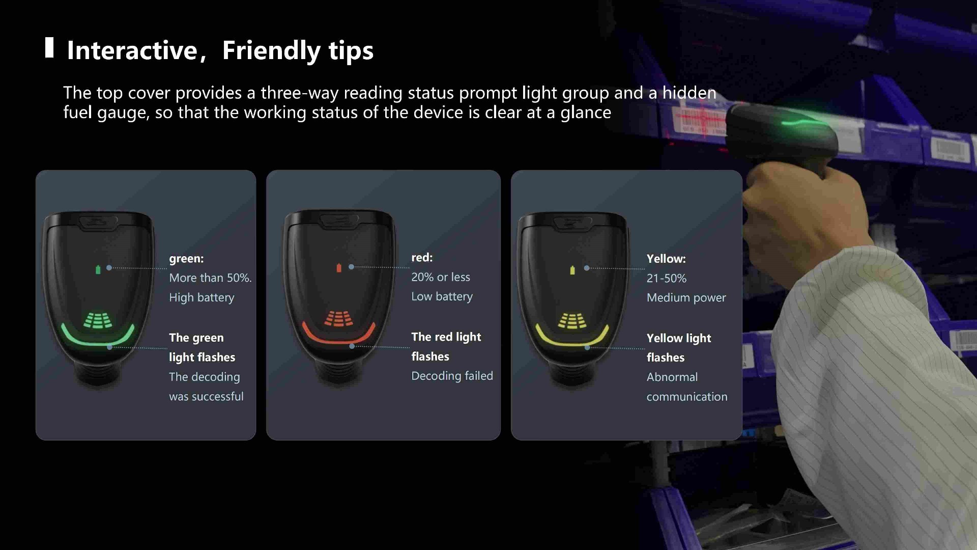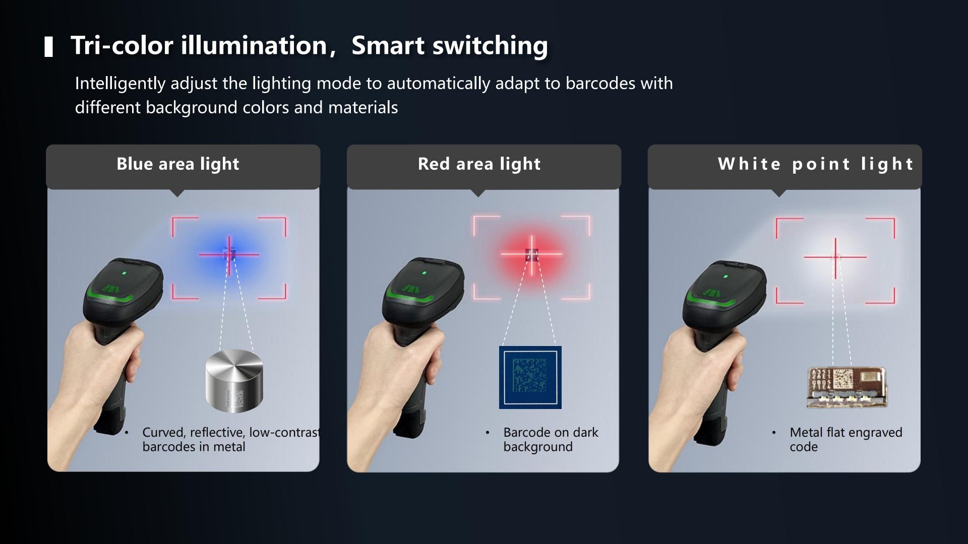 يمكن لجهاز مسح الباركود اللاسلكي FS325DP ضبط وضع الإضاءة بشكل ذكي - أزرق أو أحمر أو أبيض - للتكيف تلقائيًا مع الباركود مع ألوان الخلفية والمواد المختلفة.