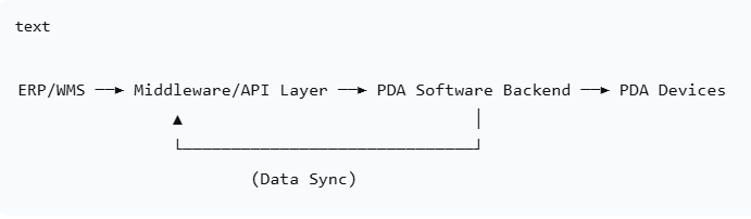 يقوم نظام تخطيط موارد المؤسسات (ERP) أو نظام إدارة المستودعات (WMS) بدفع المهام - مثل استلام الطلبات أو قوائم التجميع أو أوامر التحويل - إلى الواجهة الخلفية لبرنامج المساعد الرقمي الشخصي (PDA) عبر واجهة برمجة التطبيقات (API) أو مشغلات قاعدة البيانات.