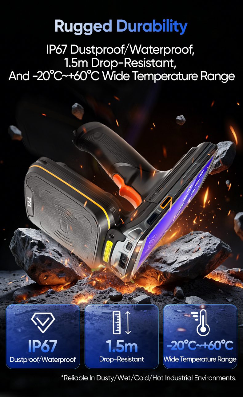 مقاوم للغبار والماء بمعيار IP67، ومقاوم للسقوط من ارتفاع 1.5 متر، ونطاق درجة حرارة واسع من -20 درجة مئوية إلى +60 درجة مئوية